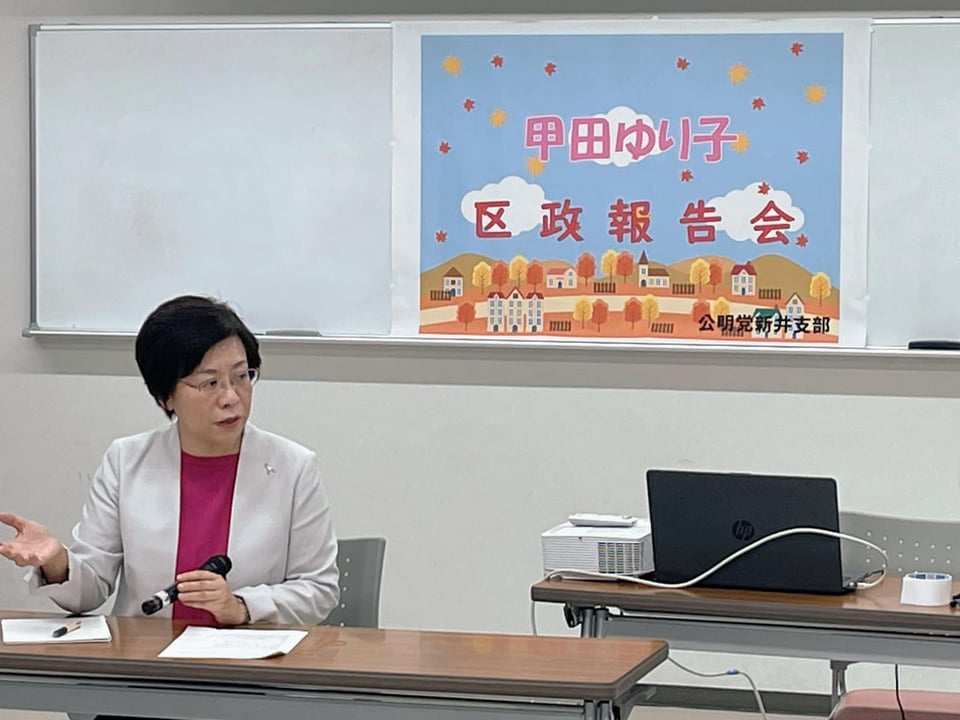 10月24日、新井区民活動センターにて、「知っておきたい!介護•福祉•終活の豆知識」のテーマで開催した区政報告会には、平日で雨にも関わらず、16名の方が参加してくださいました。